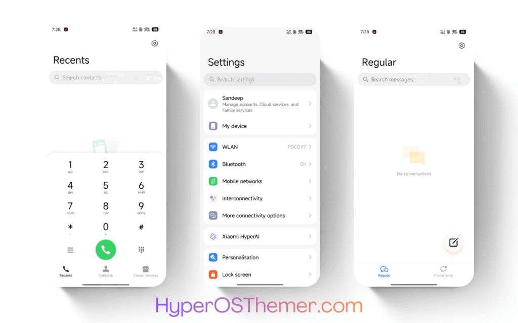The farcasters HyperOS Theme follows Xiaomi’s HyperOS design philosophy, ensuring consistency across system apps such as Settings, Security, Dialer, and System UI.