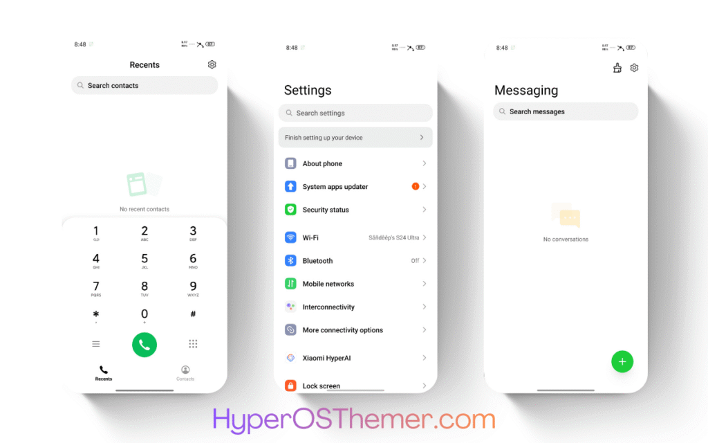 The Green Animation HyperOS Theme follows Xiaomi’s HyperOS design philosophy, ensuring consistency across system apps such as Settings, Security, Dialer, and System UI.